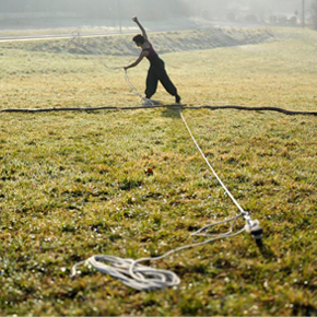 Ciel est un spectacle solo, une construction primitive, un arrangement fait de troncs d’arbre et de quelque 200 mètres de corde et d’un pneu. C’est un jeu de construction qui tend à la vertical.